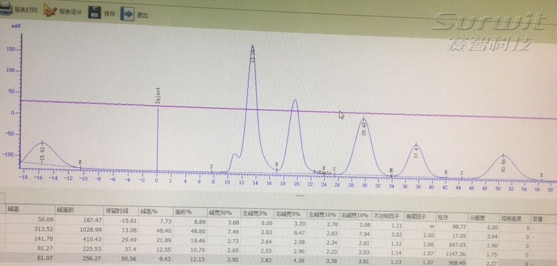 按著說明書對凝膠色譜柱進行校準,凝膠滲透色譜校準溶液得到的色譜峰應滿足以下條件,所有峰型均勻對稱,玉米油和鄰苯二甲酸二酯的色譜峰之間分辨率應大于85%,鄰苯二甲酸二酯和甲氧滴滴涕的色譜峰之間分辨率大于85%,甲氧滴滴涕和苝的色譜峰之間的分辨率大于85%,苝和硫的色譜峰不能重疊,基線分離大于90%。
