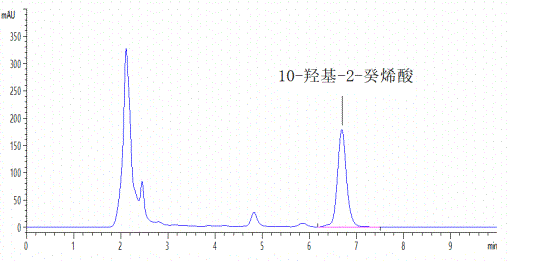 10-羥基-2-癸烯酸標準儲備液:稱取10mg(準確至0.01mg)10-羥基-2-癸烯酸標準品于10mL容量瓶中,用無水乙醇溶解并定容至刻度,搖勻。此溶液濃度為1.0 mg/mL。