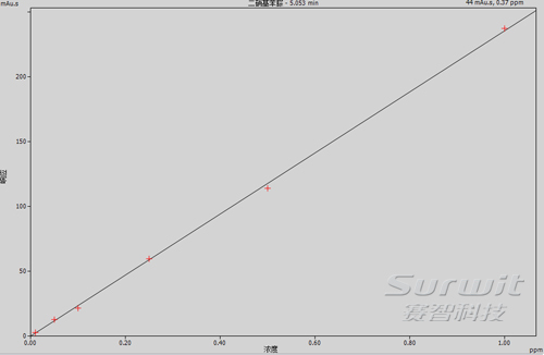 對照品溶液的制備 移去甲醛標準貯備液適量于100ml量瓶瓶中,加入4ml衍生試劑,用乙腈定容,放置15min衍生化,即得;將此標品用乙腈稀釋分別稀釋成0.01,0.05,0.1,0.25,0.5ppm的標準溶液,作為加標曲線;