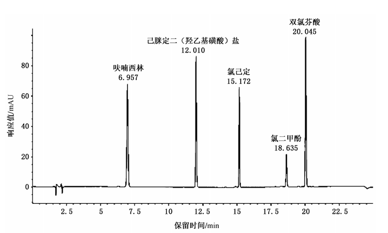 本標(biāo)準(zhǔn)適用于牙膏中氯已定、呋喃西林、雙氯芬酸、氯二甲酚和己脒定二(羥乙基磺酸)鹽5種殺菌劑含量的高效液相色譜法測(cè)定。進(jìn)甲酸-甲醇-水混合溶液超聲提取后,用高效液相色譜法測(cè)定,以保留時(shí)間定性,外標(biāo)法定量。