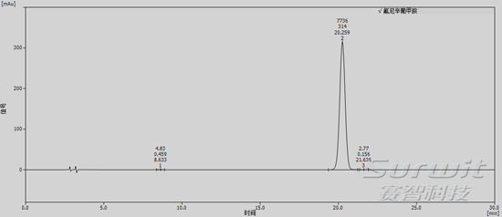 精密量取氟尼辛葡甲胺對(duì)照品適量,置容量瓶,加適量甲醇-水(7:3),超聲溶解,并用甲醇-水(7:3)稀釋成每1ml中約含氟尼辛葡甲胺1mg的溶液,搖勻,用0.45μm的有機(jī)系濾膜過(guò)濾,精密量取20μL,注入液相色譜儀,記錄色譜圖。