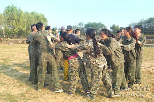 第一天,教練把大家分成兩隊,每個隊就是一個團體,大家齊心合力,榮辱與共。首先進行的是按順序交紙牌游戲,兩隊采取了截然不同的方法,通過幾次嘗試,兩隊慢慢開始找到了要領,最后紅隊通過默契合作,在規(guī)定的時間勝出。接下來的是“信任背摔”游戲。看著同事們站在1.5米的高臺上,一個個泰然自若的樣子,他們一定堅信:身后團隊是自己安全的保障。