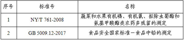 檢測方法依照《蔬菜和水果有機磷、有機氯、擬除蟲菊酯和氨基甲酸酯類農藥多殘留的測定》(NY/T761-2008)操作。