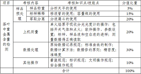 本項目全面考察學生對原子吸收分光光度法測定茶葉中重金屬含量項目的實施過程中所涉及樣品預處理、上機測量、結果數據處理等3個環節與過程的整體把握和運用能力以及在整個實驗過程中的操作文明和操作安全意識。