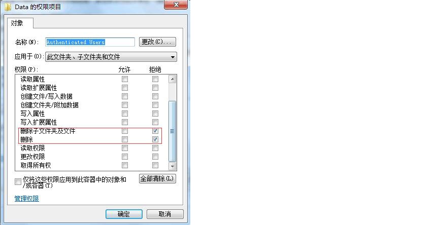 2、確定電腦為NTFS后,在Survey軟件安裝目錄下找到DAT文件夾,以WIN7為例說明設置方法:右鍵屬性→安全→高級→更改權限→選擇Authenticated Users→編輯→對刪除子文件夾及文件、刪除兩項的拒絕進行打鉤如下圖: