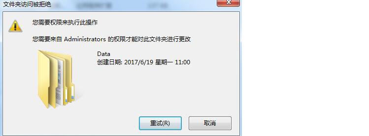 3、確定應用,然后全部點擊確定關閉屬性界面。設置好后再對DAT文件夾及文件刪除時會提示:您需要權限來執行此操作,如圖: